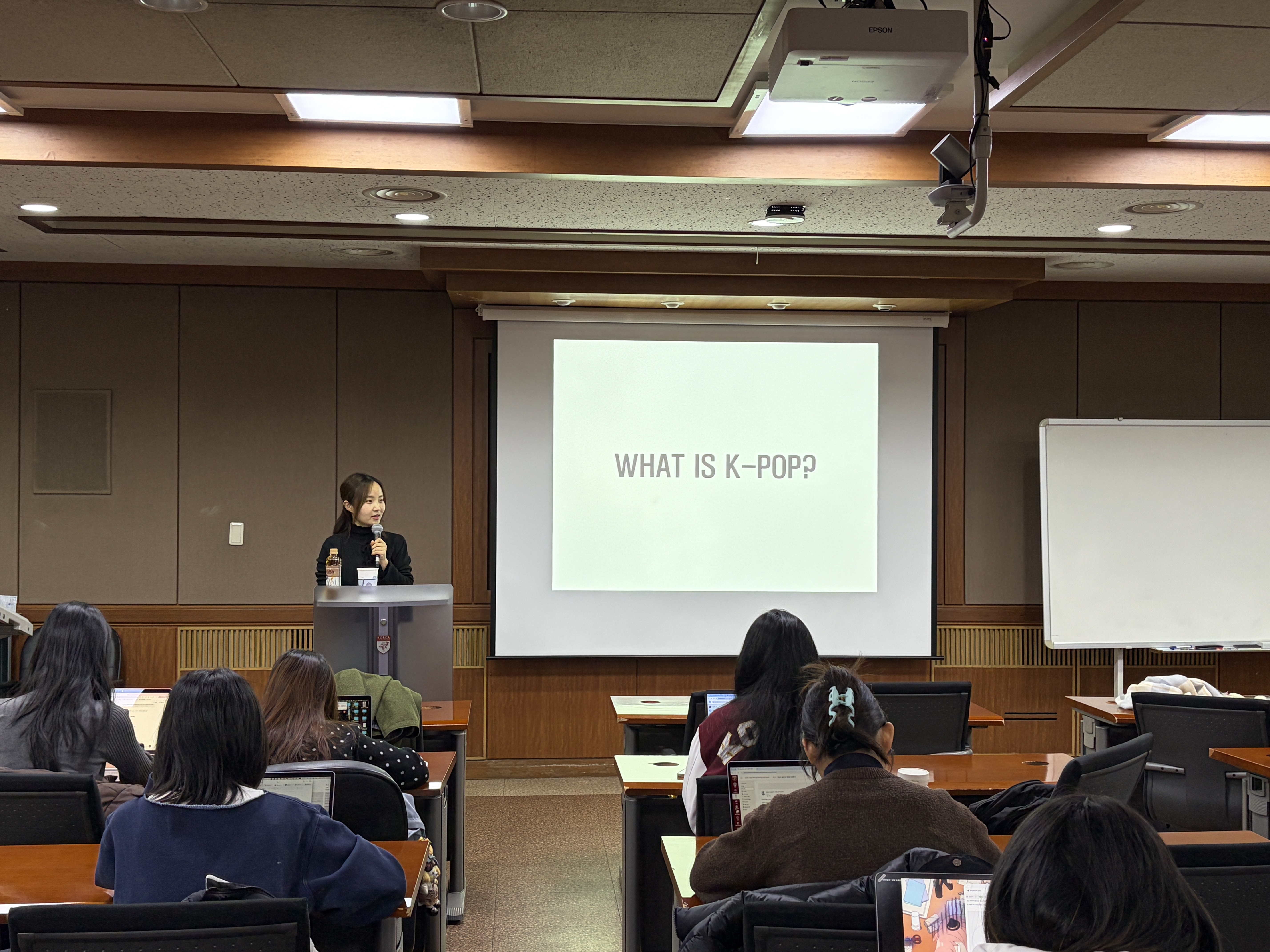 2025년 12월 1일 세계 속의 한국문화 수업(교수: 송지예)에서는 K-POP부터 인디까지 폭넓게 활동하고 계신 대중음악평론가 김윤하 선생님의 특강이 진행되었습니다. 강의에서는 1세대 아이돌부터 현재 글로벌 음악 시장을 이끄는 4~5세대 아이돌까지, K-POP이 세계적으로 주목받는 이유와 그 매력에 대해 살펴보는 시간을 가졌습니다. |