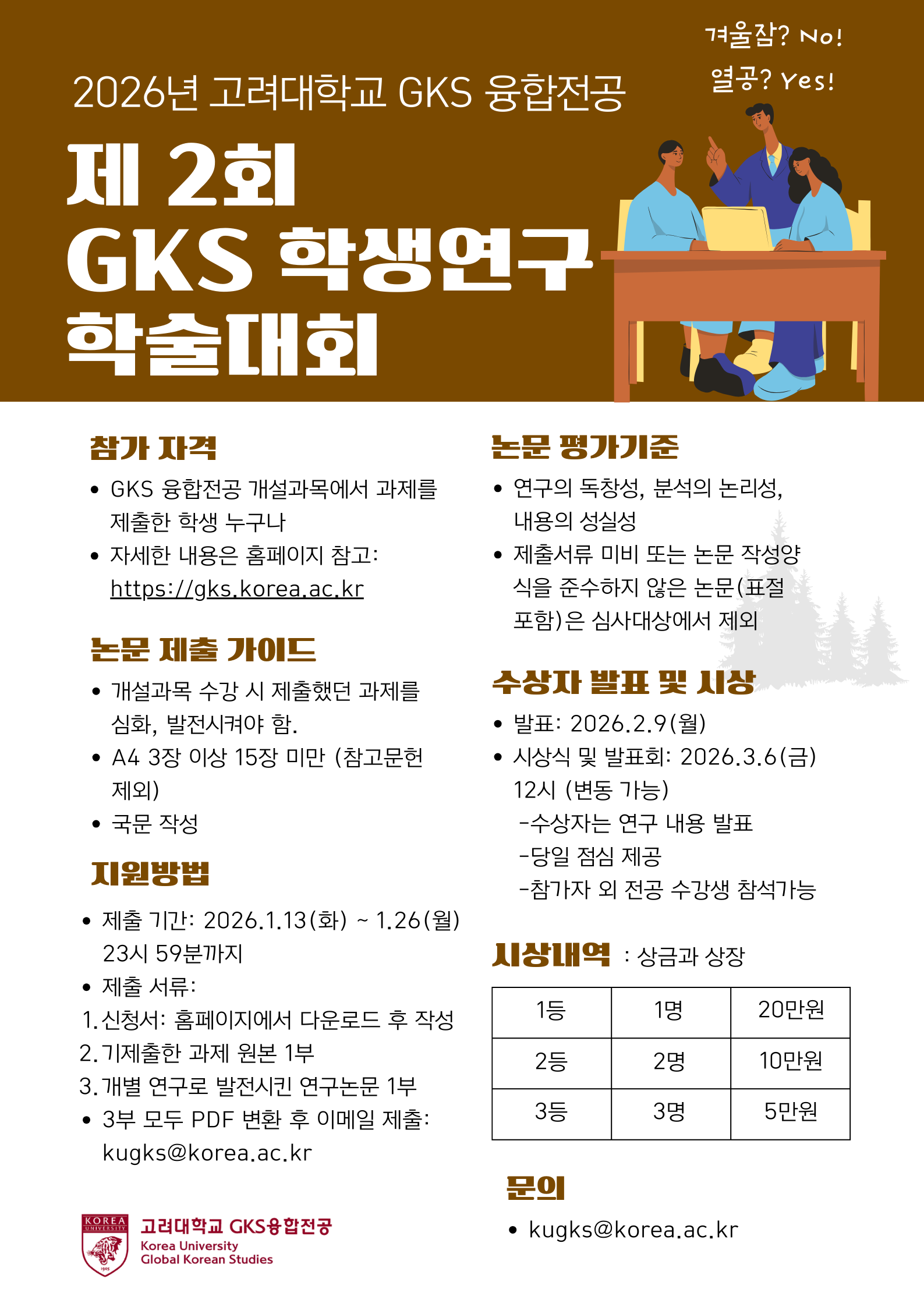 GKS융합전공에서는 학생들의 글로벌 한국학에 대한 관심을 높이고 연구 활동을 활성화하기 위해 두번째 학생연구 학술대회를 개최합니다. 참가자격은 GKS융합전공생으로 GKS융합전공 개설과목에서 과제를 제출한 학생이어야 합니다. 연구 논문은 국문으로 작성해야 하며, 해당 과목 수강시 제출한 과제를 심화, 발전시켜 제출해주시기 바랍니다.
